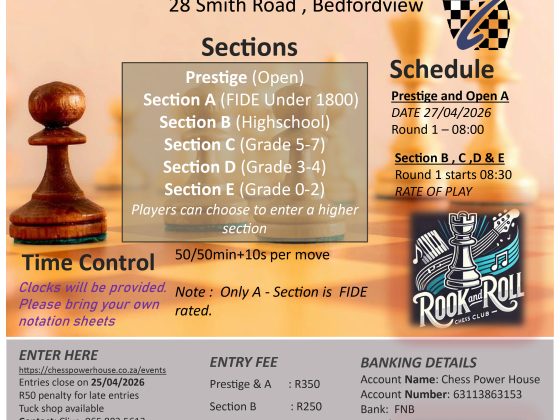 DATE Monday 27 April 2026 SECTIONS Prestige (Open) Section A (FIDE under 1800) Section B (Highschool) Section C (Grd 5-7)