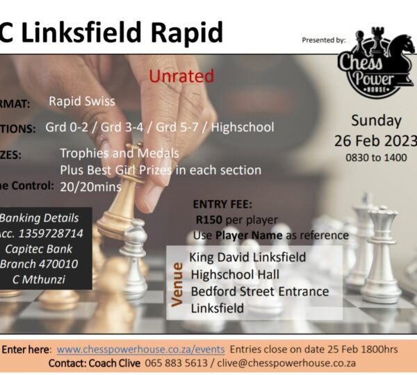 Format: 20/20min Rapid. Sections: Grd 0-2 / Grd 3-4 / Grd 5-7 High School. Prizes: Trophies and Medals / Best Girl Prize in each section.